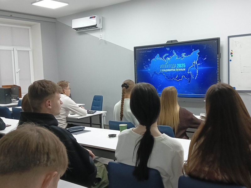 Студенты первого курса направления «Экономика и управление» под руководством преподавателя Юлии Владимировны Марус стали активными участниками этого значимого национального события, присоединившись к просмотру прямой трансляции «Итоги года с Владимиром Путиным-2025».